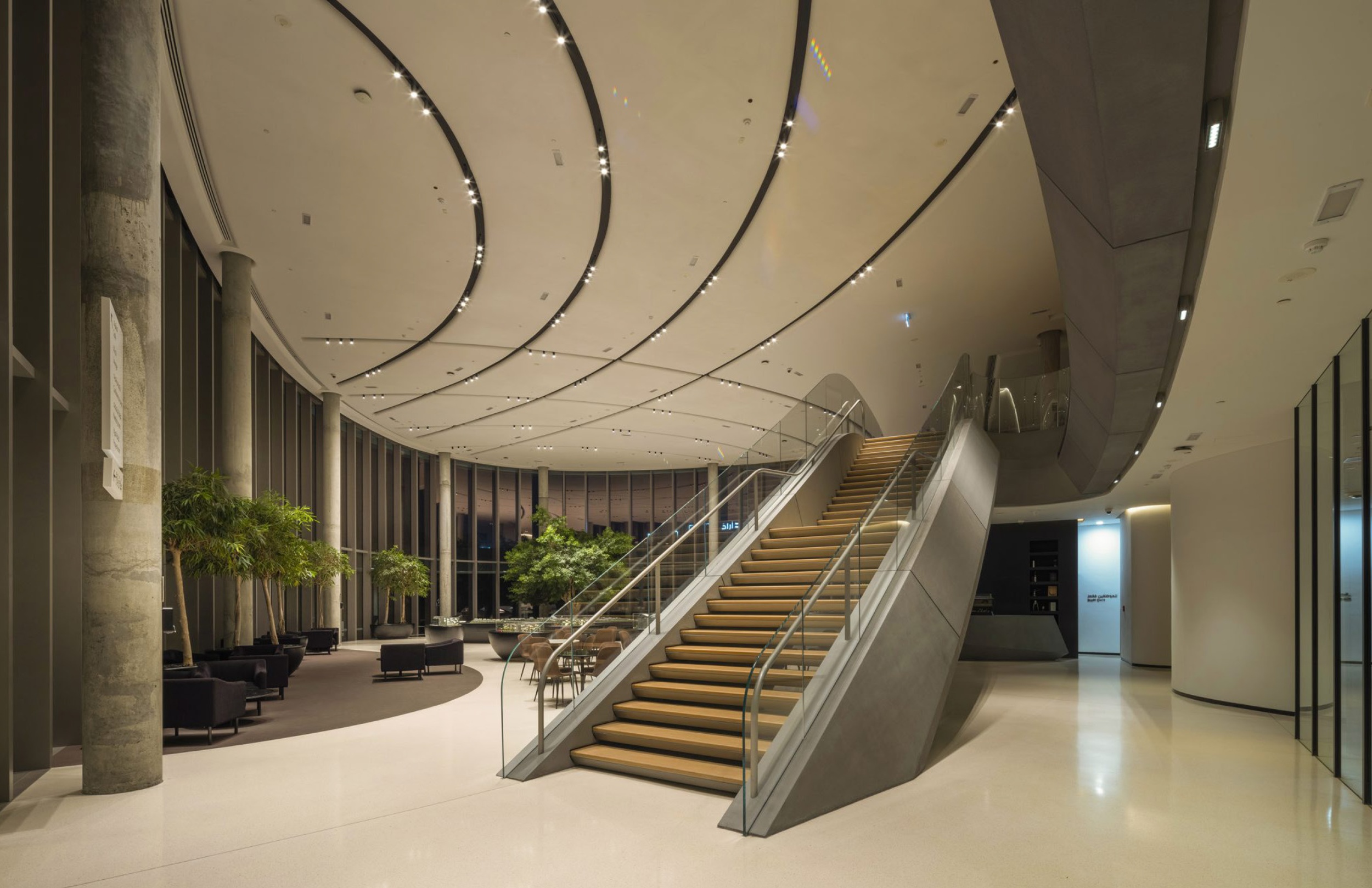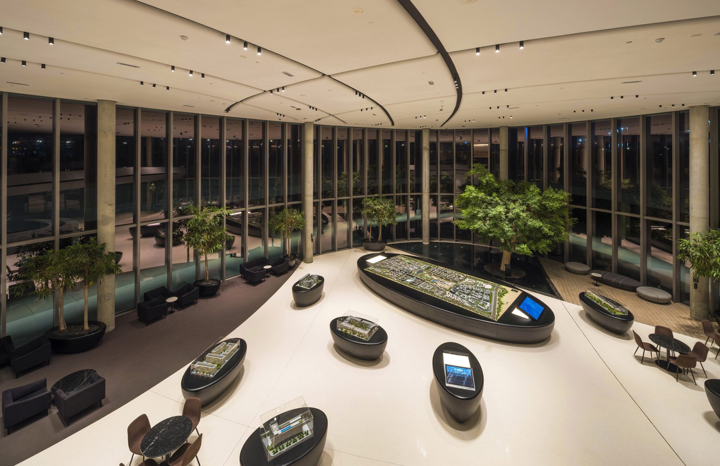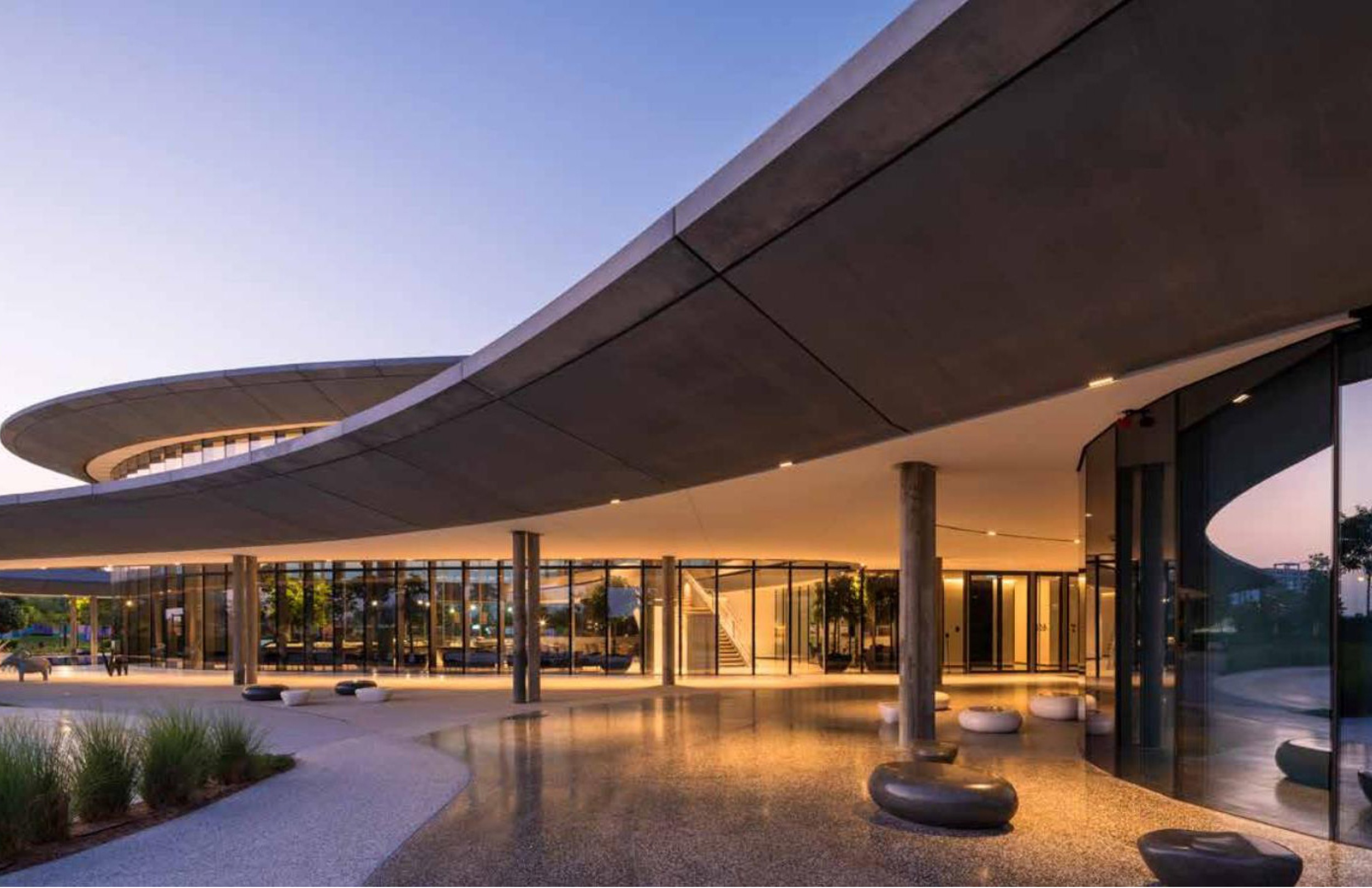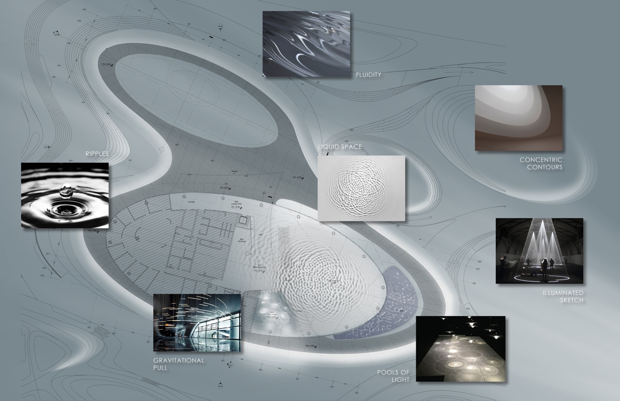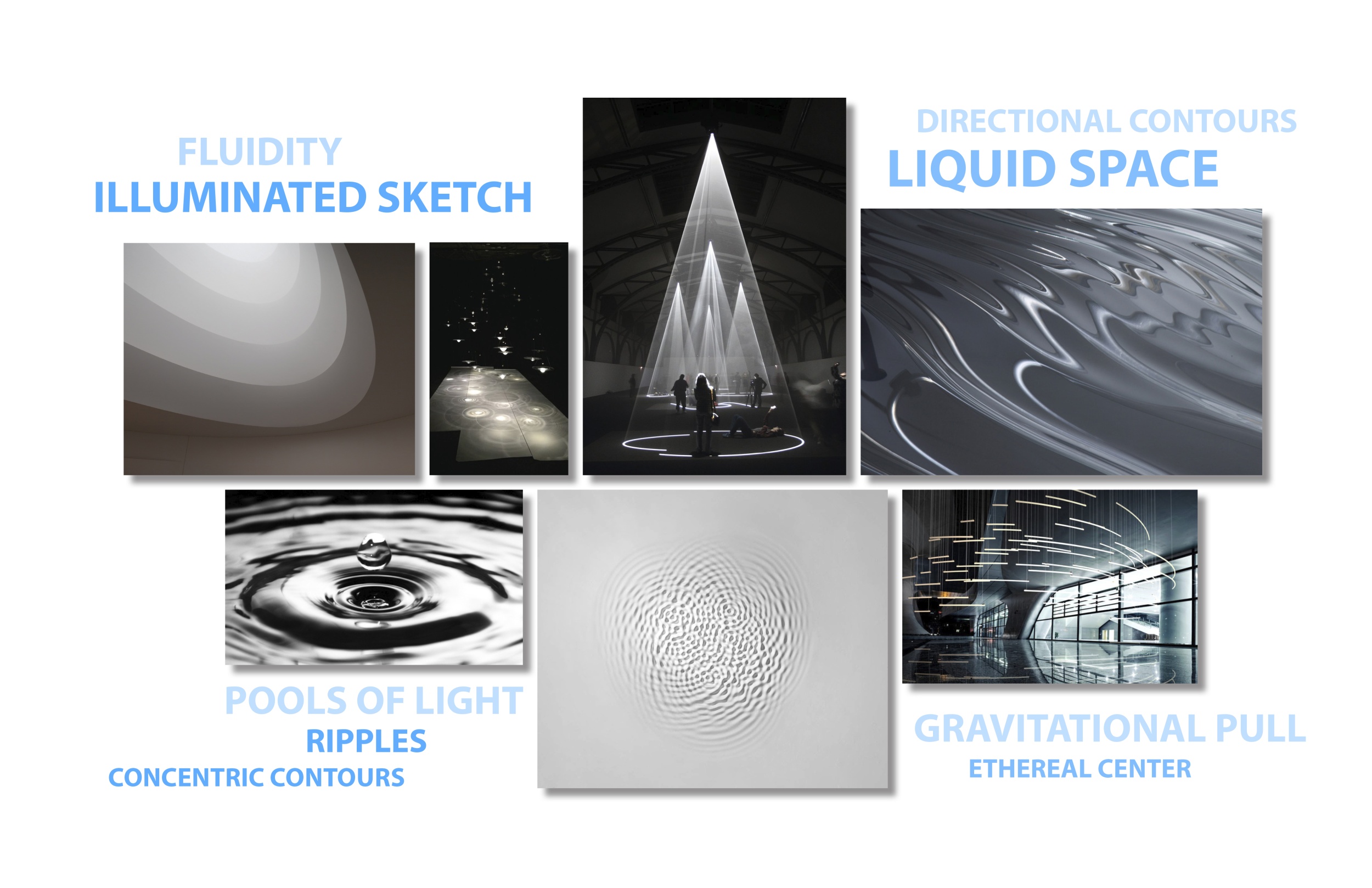 The graceful descent of a single water droplet forms a ripple effect that translates to fluid patterns and delineating neighborhoods of light throughout interior and exterior spaces.